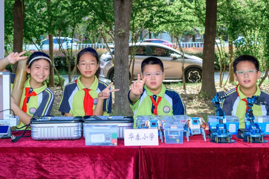 身着银色服装的同学和机器人一同起舞,科技感十足的呈现方式让人眼前一亮;20台无人机腾空而起,在空中起舞,引得同学们阵阵惊呼⋯⋯活动现场可谓精彩纷呈,科技感十足。现场设置的12个科技成果体验区人气高涨,各类机器人、创客作品与科技展品吸引众人驻足。在发电自行车展示区,四年级学生张梦辰奋力踩踏,让LED灯带逐渐亮起,她兴奋地说:“原来骑车的力气能变成电,太神奇了!”