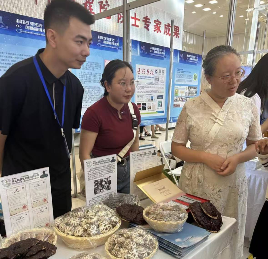 展台上,各小院带来的特色农产品琳琅满目:潜江小龙虾科技小院的速冻虾尾,通过-190℃快速冷冻技术锁住99%的鲜虾口感,还展示了12项冷链物流与电商标准;仙桃再生稻科技小院的“稻再鸭菇”系列产品,直观呈现“一田五收”生态模式的增收成效;随州食用菌科技小院则带来香菇栽培技术手册,详细介绍了40余年从试验基地到“中国香菇之乡”的产业升级历程。