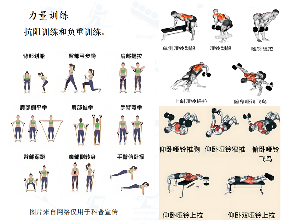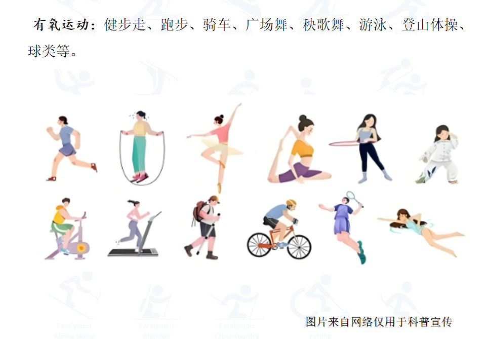 根据运动目的,运动类型包括健步走、跑步、骑车等提高心肺功能的有氧运动,促进肌肉生长的抗阻或负重训练,以及单足站立、太极拳、瑜伽等促进平衡和柔软性的训练。健身者可兼顾爱好选择运动类型,便于长期坚持形成健康生活方式。