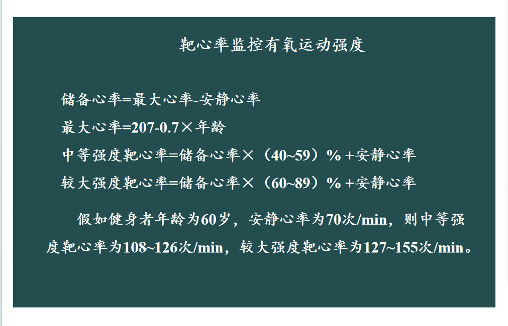 假如健身者年龄为60岁,安静心率为70次/min,则中等强度靶心率为108~126次/min,较大强度靶心率为127~155次/min。采用运动手环或运动手表使运动中心率处于相应强度区间即可。