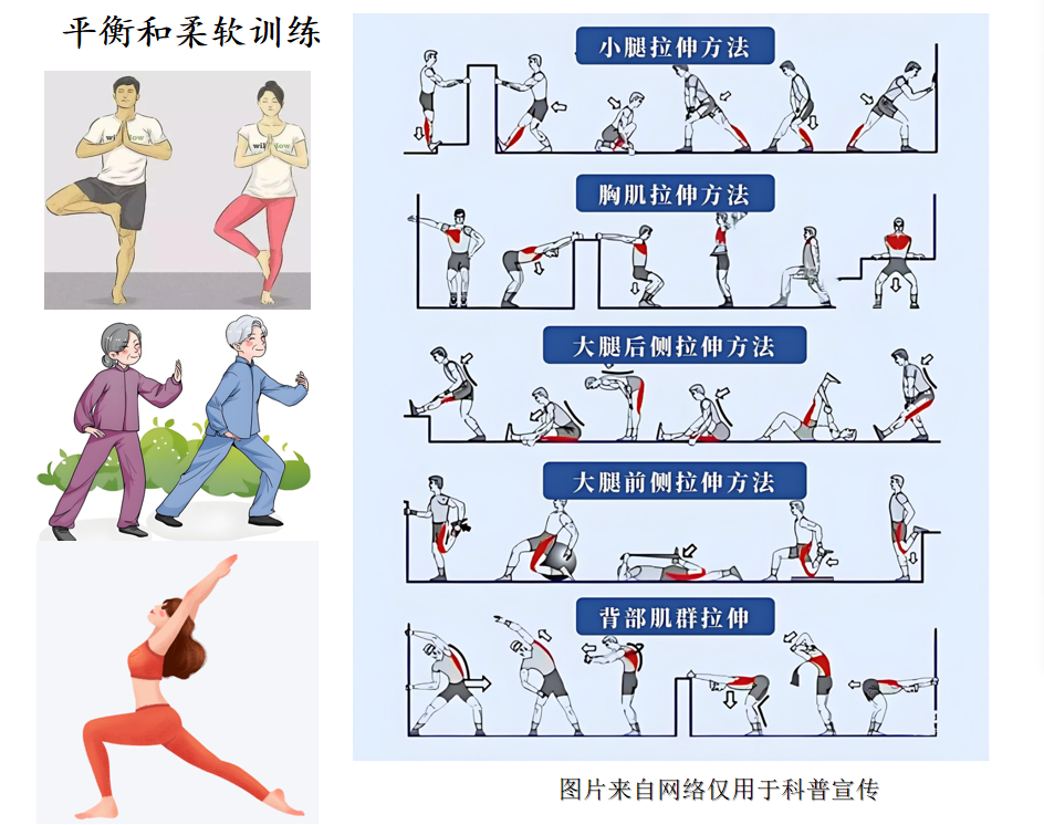推荐成年人、老年人至少完成每周150~300分钟中等强度或每周75~150分钟较大强度的有氧运动,或中等和较大强度等量组合;每周进行2~3次力量训练和柔韧性训练,拉伸等柔韧性训练每日1次较佳。为预防跌倒,推荐老年人每周进行2次平衡训练。推荐儿童和青少年每天进行至少60分钟中等至较大强度的有氧运动,每周至少3次强壮肌肉骨骼的运动[3]。