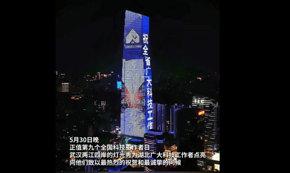 “向奋战在荆楚大地的科技工作者致敬!”5月30日晚,正值第九个全国科技工作者日,武汉两江四岸的灯光秀为湖北广大科技工作者点亮,向他们致以最热烈的祝贺和最诚挚的问候。 ...(详细)